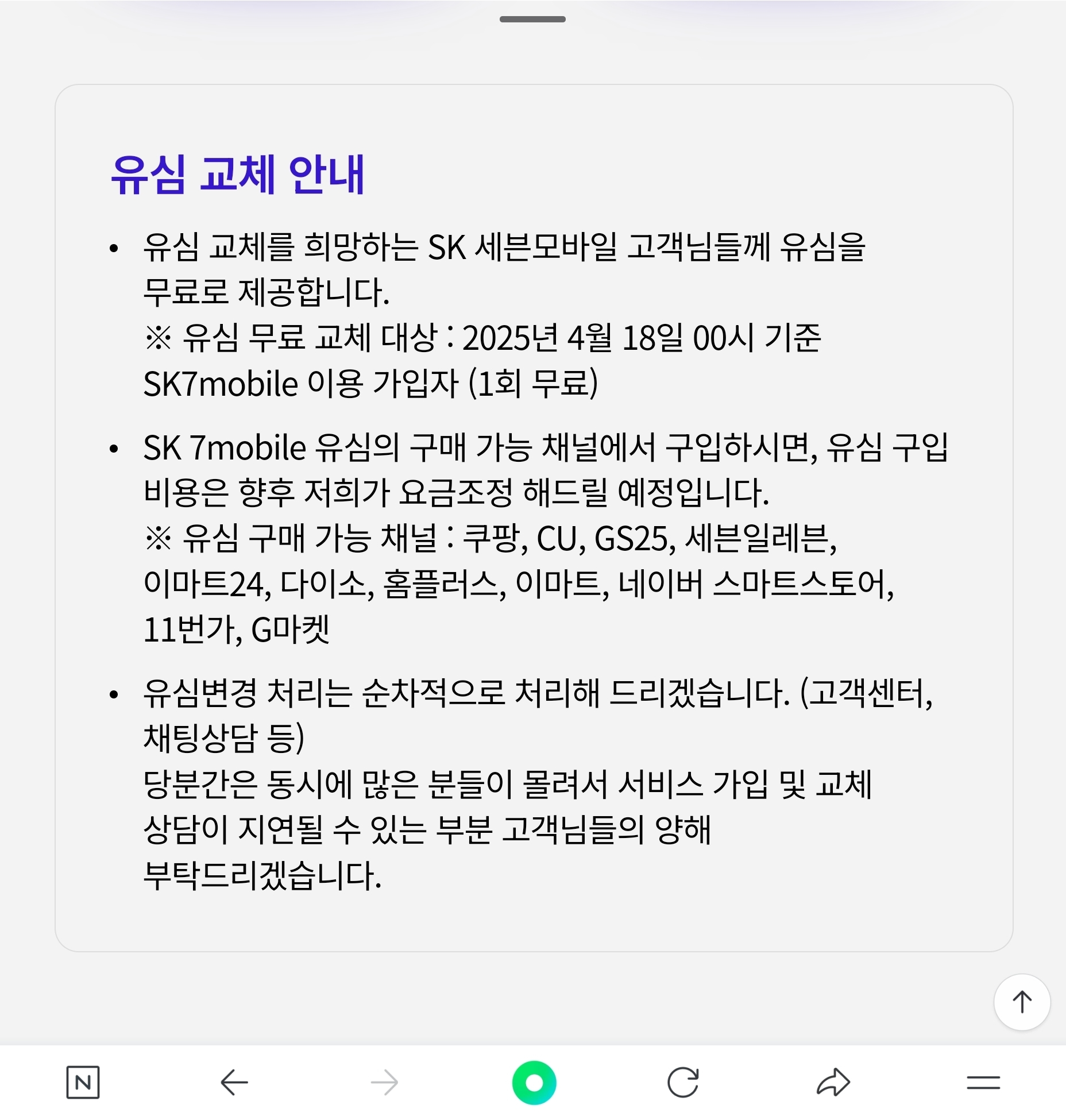 ※ 유심 무료 교체 대상 : 2025년 4월 18일 24시 기준 SK 7mobile 이용 가입자 (1회 무료)